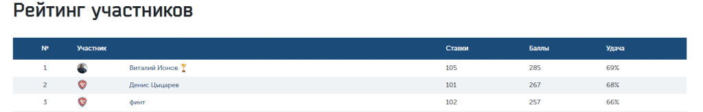 Получается, что баланс Виталия Ионова сегодня 285 баллов. Если бы турнир завершился сегодня, Виталий получил 285 рублей. Немного? Поэтому мы и утверждаем, еще не поздно присоединиться к нашему конкурсу! Ведь самое интересное впереди! Самые крупные заработки можно сделать в Тотализаторе - сейчас джек-пот составляет тысячу рублей и он будет расти, пока один или несколько счастливчиков не сорвут куш!